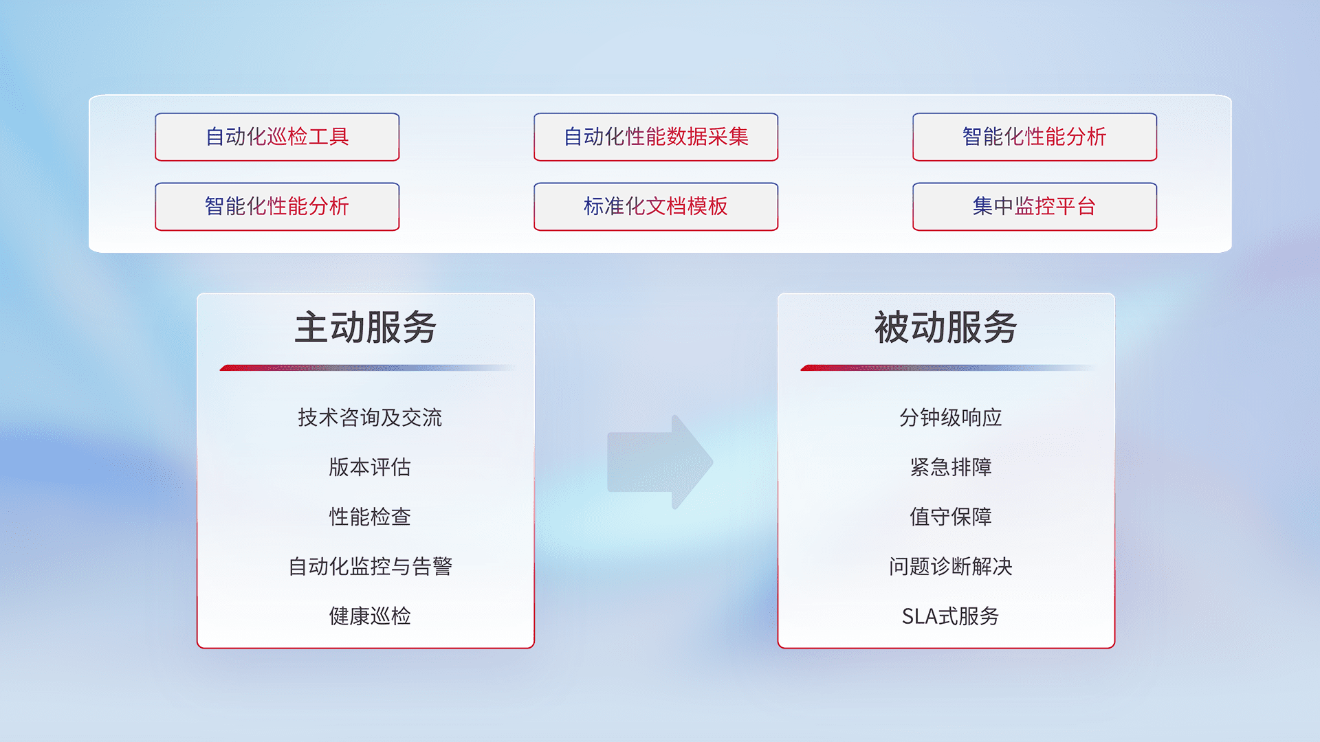 智能化工具和标准化文档,,保障服务质量,,,提供主动服务(包含技术咨询、、、版本评估、、性能检查、、自动化监控与告警、、、健康巡检)和被动服务包含(分钟级响应、、、、紧急排障、、、、值守保障、、、问题诊断解决、、、SLA服务)。。。