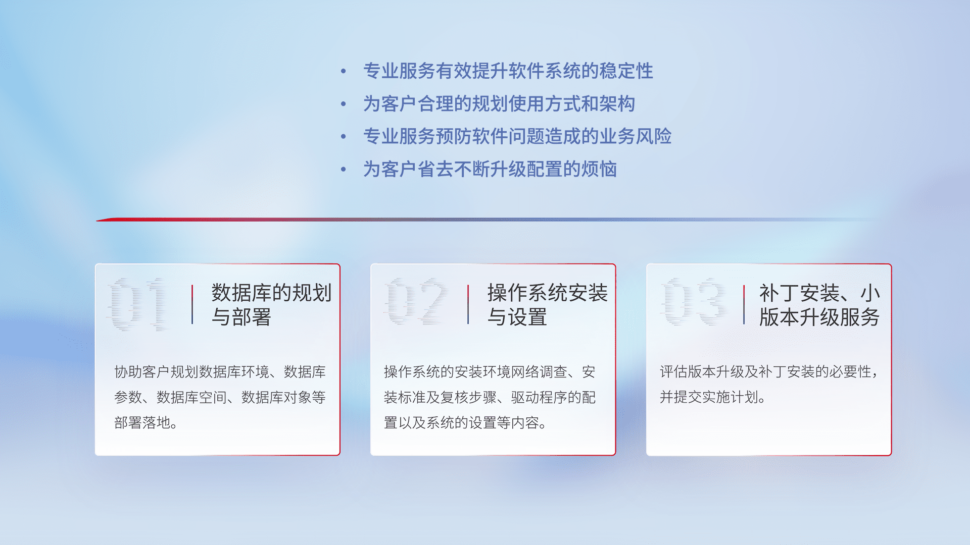 为客户提供软件规模升级、、、快速部署、、、按需配置的专业服务,,从数据库的规划与部署到操作系统的安装与设置,,,再到补丁安装和小版本升级提供支持。。