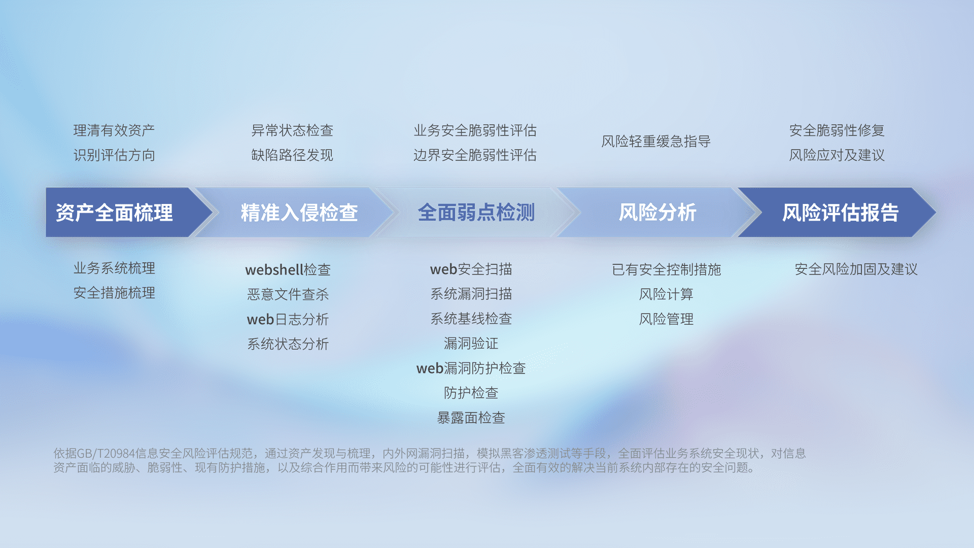 针对客户行业特性,,,以专业的安全服务+多厂商联合解决方案提供专属的一站式安全管理服务,,,,帮助客户全面感知网络空间威胁,,基于识别、、、检测、、分析、、防护、、、监测、、、响应的服务理论模型,,,从方案咨询、、、集成交付、、、、评估验证、、、、优化加固、、运维运营,,,致力于为客户提供完整的闭环管理式安全服务。。以实战经验为客户打造高抵御风险的安全体系,,,,帮助客户发现威胁、、、、对抗威胁、、、处置威胁,,,,不断积累安全对抗能力,,,,持续保障数字化安全。。。。